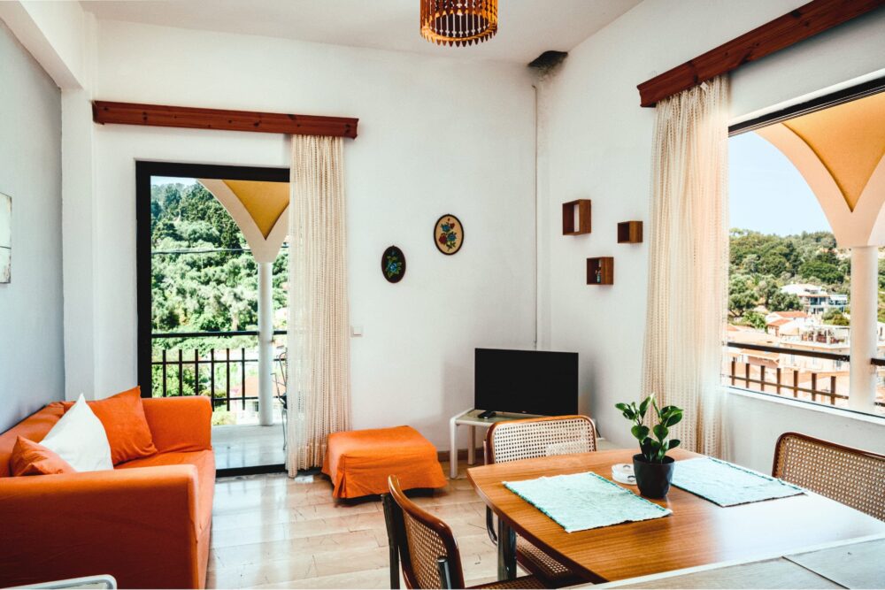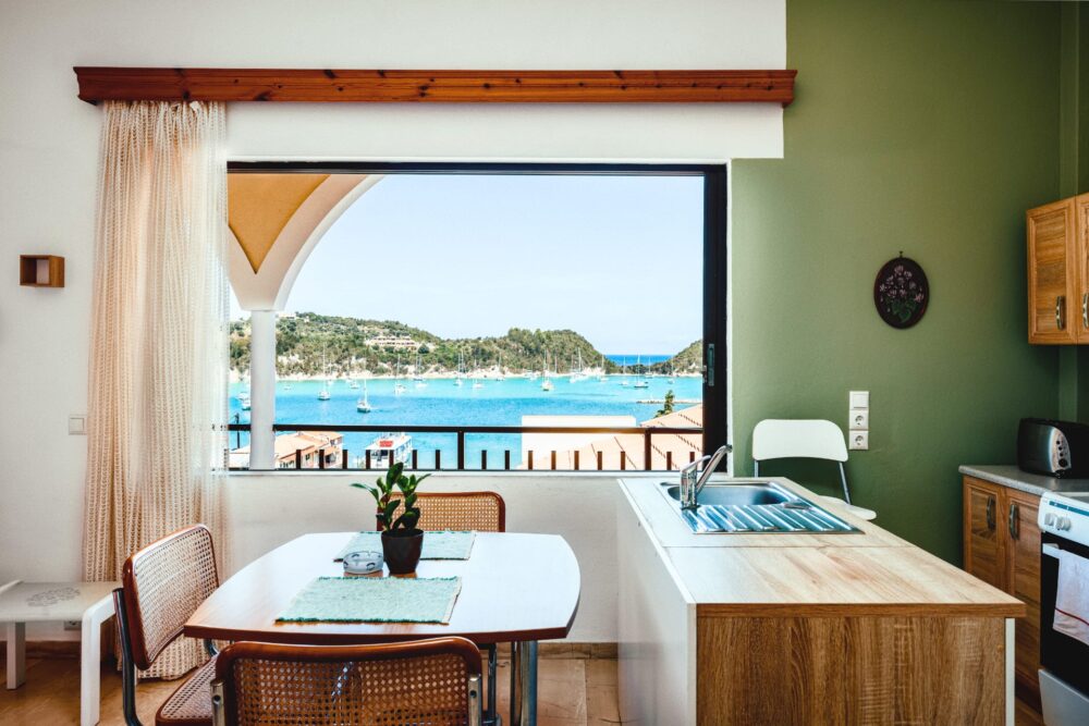 For entertainment and relaxation, the studio features a comfortable sofa, a TV, and a stylish dining table set against a wide window overlooking the bay. The abundance of natural light, combined with the refreshing sea breeze, ensures a pleasant and airy atmosphere, making it an ideal escape from the summer heat of the Greek Ionian sun. Whether you’re seeking a romantic retreat or a peaceful solo getaway, this dreamy studio is a true haven of comfort and charm.